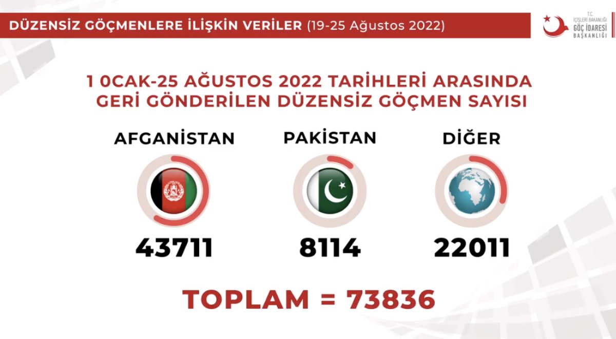 Aynı tarihler arasında 1282'si Afganistan, 244'ü Pakistan ve 857'si diğer uyruklardan olmak üzere toplam 2 bin 383 düzensiz göçmen sınır dışı edildi. Böylece 2022 yılının başından bu yana sınır dışı edilen düzensiz göçmen sayısı 73 bin 836'ya yükseldi.
