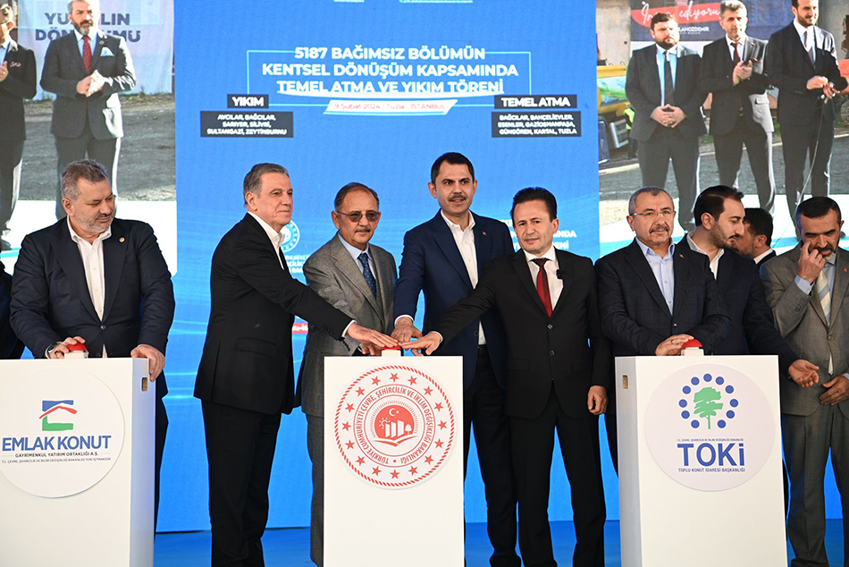 İstanbul’da 5 bin 187 bağımsız bölüm için temel atma ve yıkım töreni yapıldı. Törene, Çevre, Şehircilik ve İklim Değişikliği Bakanı Mehmet Özhaseki, Cumhur İttifakı İstanbul Büyükşehir Belediye Başkan adayı Murat Kurum, Tuzla Belediye Başkanı Dr. Şadi Yazıcı ve TOKİ Başkanı Ömer Bulut katıldı. Tören Tuzla’da gerçekleşti ve Bağcılar ilçesindeki Kentsel Dönüşüm Projeleri Yıkım Töreni ile canlı bağlantı kuruldu.