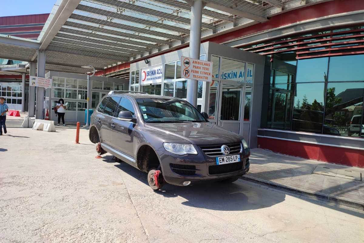 Olay, Afyonkarahisar Devlet Hastanesi Acil Servis önünde meydana geldi. Fransa'dan gelen ve kimliği henüz belirlenemeyen gurbetçi bir vatandaş EM 285 LP plakalı aracı ile rahatsızlanınca hastanenin yolunu tuttu. İddiaya göre, sürücü gece geç saatlerde geldiği hastanede uyarı levhalarını fark etmeyince aracı ile ters kapanın üzerinden geçti. Aracın 3 lastiği birden yarılan otomobili gurbetçi vatandaş ardından hastanenin Acil Servisi önüne park ederek oto lastikçi çağırdı. Olay yerine gelen lastikçi ise yarılan lastikleri söküp aracı takoz diye tabir edilen desteklerin üzerine koydu.