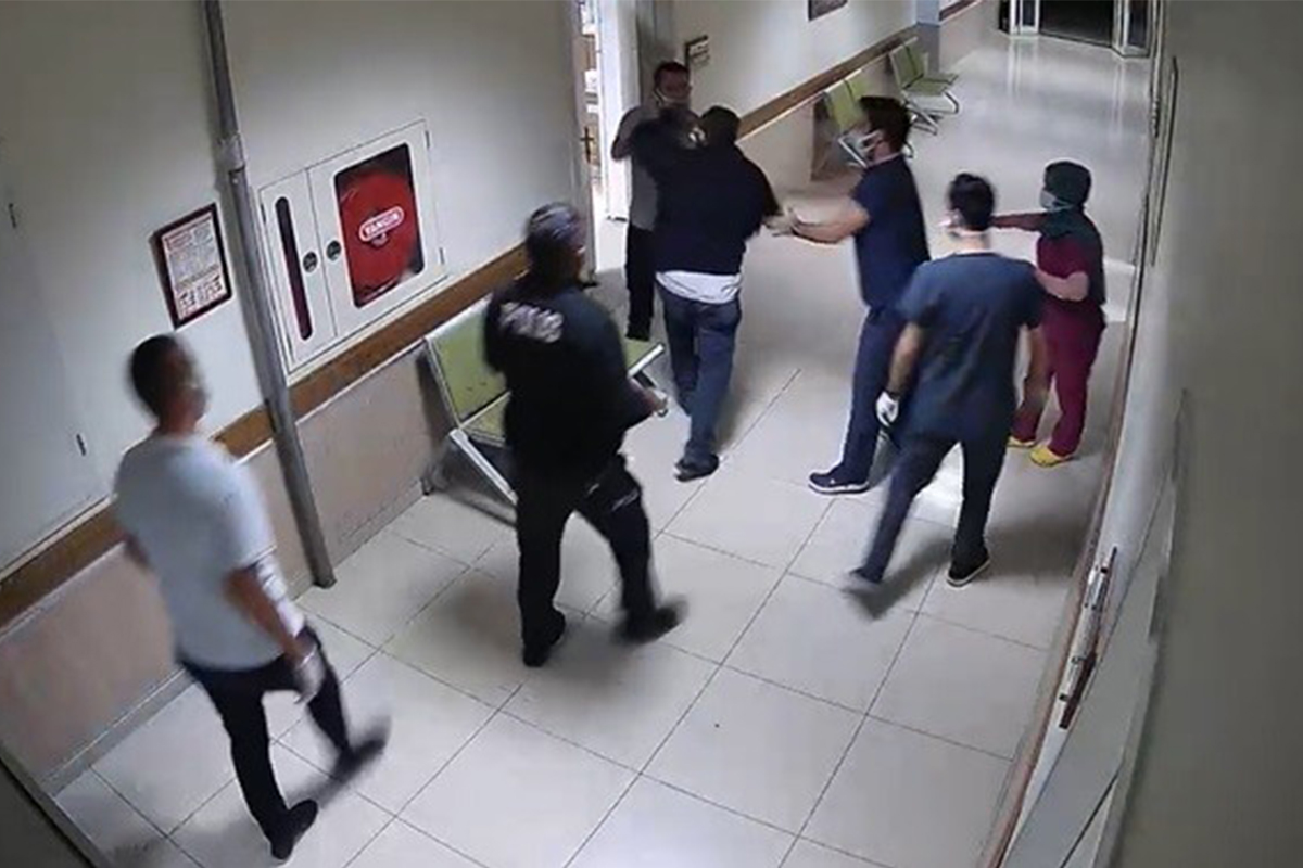 Hastanede sağlık işlemleri sırasında M.A.Ö'nün yakınları olduğu öğrenilen ve yüksek promilde alkol aldıkları tespit edilen A.Ö., ve Z. Ö. de olayı duyarak hastaneye geldi. Görevli sağlık ve polis ekiplerine hakaret ve polisleri tehdit eden iki kişi görevli ekiplere saldırarak darp etti. Şahıslar takviye ekip çağrılarak güçlükle kontrol altına alındı. Hastane basarak taşkınlık çıkartan ve görevli memurlara saldıran şahıslar hastanenin güvenlik kamerası tarafından saniye saniye görüntülendi. Görüntülerde, hastaneye gelen iki kişinin sağlık ve polis ekiplerine küfür ederek saldırması daha sonra hastane polisi tarafından tek şahsın bir odaya alınarak kontrol altına alınması görülüyor. Öte yandan, olayda yaralanan 3 polis memurundan 1'ine 5 gün ve 2 çarşı mahalle bekçisinden 1'ine 3 gün iş göremez raporu verildi.