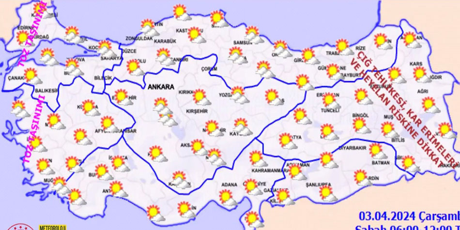 Yapılan son değerlendirmelere göre; yurdun kuzey, iç ve batı kesimlerinin parçalı bulutlu, Sinop, Rize ve Artvin çevreleri ile Samsun'un batı ilçeleri ve Trabzon'un doğusunun aralıklı sağanak yağışlı, Ardahan çevrelerinin karlakarışık yağmur yükseklerinin kar yağışlı, diğer yerlerin az bulutlu ve açık geçeceği tahmin ediliyor. Marmara ve Ege'de hafif toz taşınımı bekleniyor. Doğu Karadeniz’in iç kesimleri ile Doğu Anadolu’nun kuzey ve doğusunda çığ tehlikesi, kar erimeleri ve heyelan riski bulunmaktadır.