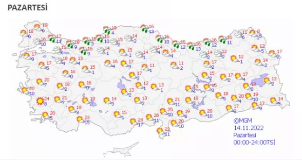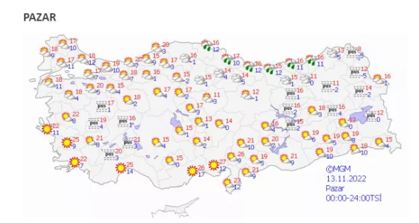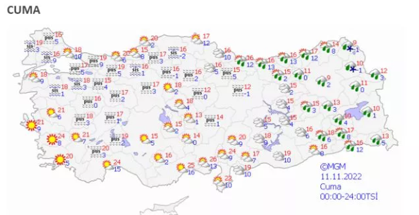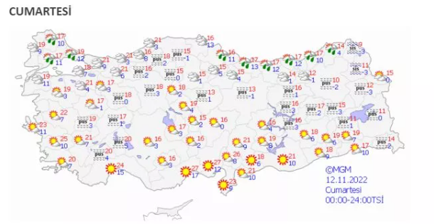 Yurdun iç ve doğu kesimlerinin parçalı ve yer yer çok bulutlu, Doğu Karadeniz, Doğu ve Güneydoğu Anadolu ile Osmaniye, Hatay ve Kahramanmaraş çevrelerinin yağışlı, diğer yerlerin az bulutlu ve açık geçeceği tahmin ediliyor. Yağışların genellikle yağmur ve sağanak, Doğu Karadeniz'in iç kesimlerinin yüksekleri ve Doğu Anadolu'nun kuzey ve doğusunun yükseklerinde karla karışık yağmur ve yer yer kar şeklinde olması bekleniyor. Sabah ve gece saatlerinde Marmara, İç Ege, İç Anadolu'nun kuzeyi ile Batı ve Orta Karadeniz'in iç kesimlerinde yer yer sis ve pus olayı bekleniyor.
