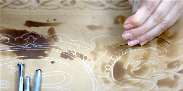 Derilerin seçilmesinden başlayarak her aşamayla ilgilenen Şenol ve Yağcı, titizlikle işledikleri derilere Ulu Cami, Tophane Saat Kulesi gibi Bursa'nın önemli tarihi yapıları ile Osman Gazi figürlerini aktarıyor.