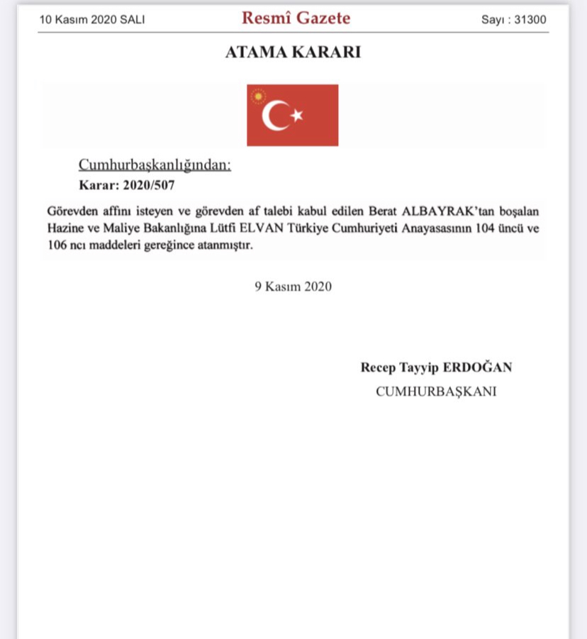 Gelen son haberlere göre, Cumhurbaşkanı kararı ile Hazine ve Maliye Bakanlığı görevine Lütfi Elvan atandı.
