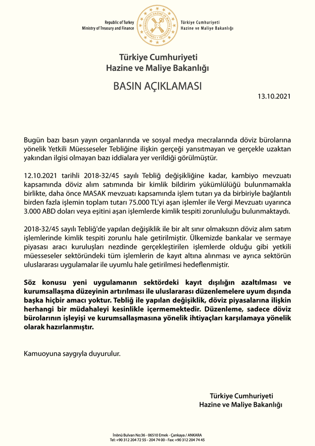 -Bazı basın yayın organlarında ve sosyal medya mecralarında döviz bürolarına yönelik Yetkili Müesseseler Tebliğine ilişkin gerçeği yansıtmayan ve gerçekle uzaktan yakından ilgisi olmayan bazı iddialara yer verildiği görülmüştür.