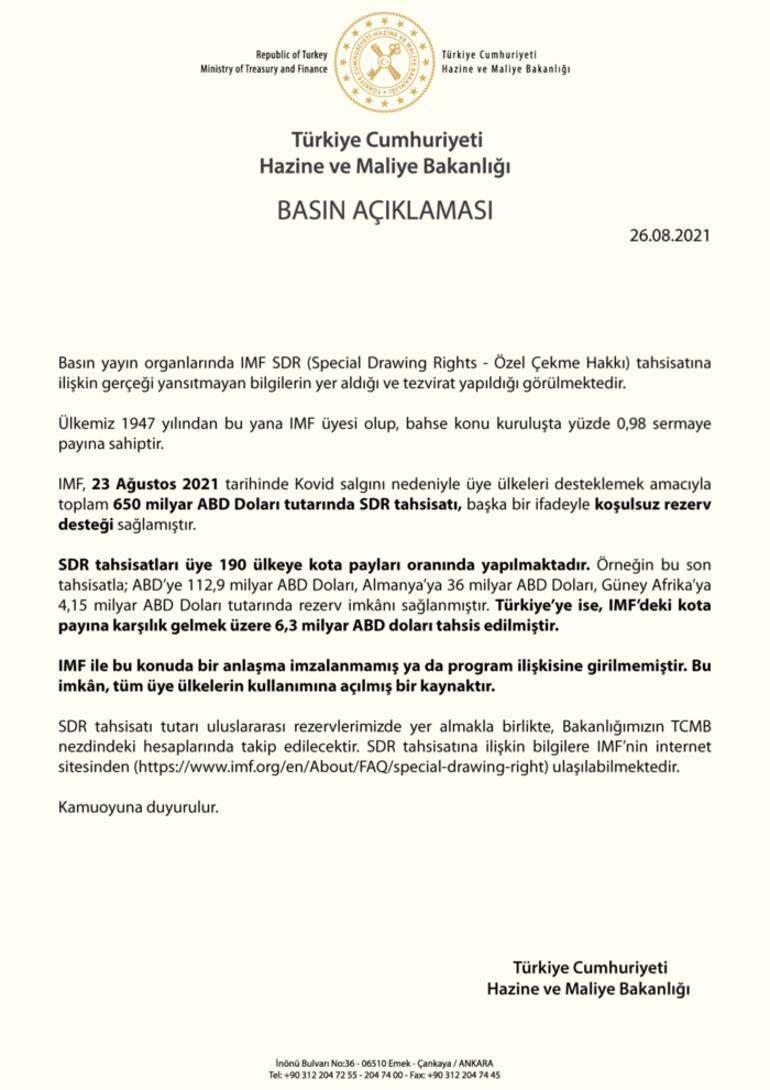 Hazine ve Maliye Bakanlığı, IMF SDR (Special Drawing Rights-Özel Çekme Hakkı) tahsisatlarının üye 190 ülkeye kota payları oranında yapıldığını belirterek, "Türkiye'ye, IMF'deki kota payına karşılık gelmek üzere 6,3 milyar dolar tahsis edilmiştir. IMF ile bu konuda bir anlaşma imzalanmamış ya da program ilişkisine girilmemiştir. Bu imkan, tüm üye ülkelerin kullanımına açılmış bir kaynaktır." açıklamasında bulundu.