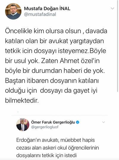 Resmi Twitter hesabından paylaşım yapan HDP Kocaeli Milletvekili Ömer Faruk Gergerlioğlu, Cumhurbaşkanı ve AKP Genel Başkanı Recep Tayyip Erdoğan'ın avukatının 15 Temmuz darbe girişiminin ardından, müebbet hapis cezası alan 355 askeri okul öğrencisinin dosyalarını tetkik için istediğine ilişkin bir açıklamada bulundu.