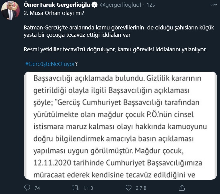 Halkların Demokratik Partisi (HDP) milletvekilleri ve Kadın Kolları tarafından, Gercüş'te bir çocuğun kamu görevlilerin tecavüzüne uğradığı iddiası ortaya atıldı. İddia, "Gercüş'te neler oluyor?" etiketiyle sosyal paylaşım sitesi Twitter'da kısa sürede gündem oldu.