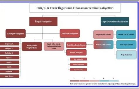 İddianamede, PKK'nın finans faaliyetlerine ilişkin olarak, örgütün finans yönetiminin ilk dönemlerde elebaşı Abdullah Öcalan'ın bizzat kendisi ve kontrolündeki Merkez Komite ve bu komiteden görevlendirilen bir üye tarafından kontrol edildiği ancak zaman içerisinde örgütün ihtiyacına ve kaynaklarına göre daha karmaşık hale geldiği anlatıldı. Örgütün 'Ekonomik ve Mali Sistemine' ilişkin, ekonomi ve maliye komitesinin koordinesinde ve bütçe sistemi içinde yıllık bir planlamayla yürütüldüğü, mali alana ilişkin, maliye komitelerinin her alanda örgütlendiği, tüm çalışmaların bu komitelerde merkezileştirilmesi ve denetim kurulu oluşturularak her alanda tüm gelir-gide kaynaklarının düzenli biçimde denetlendiği aktarıldı.