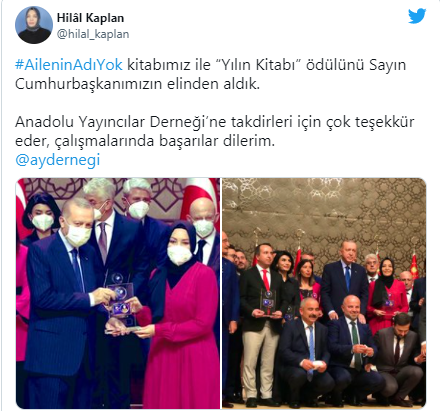 Twitter hesabından paylaşımda bulunan Kaplan, "Ailenin Adı Yok' kitabımız ile 'Yılın Kitabı' ödülünü Sayın Cumhurbaşkanımızın elinden aldık. Anadolu Yayıncılar Derneği’ne takdirleri için çok teşekkür eder, çalışmalarında başarılar dilerim" ifadelerini kullandı.