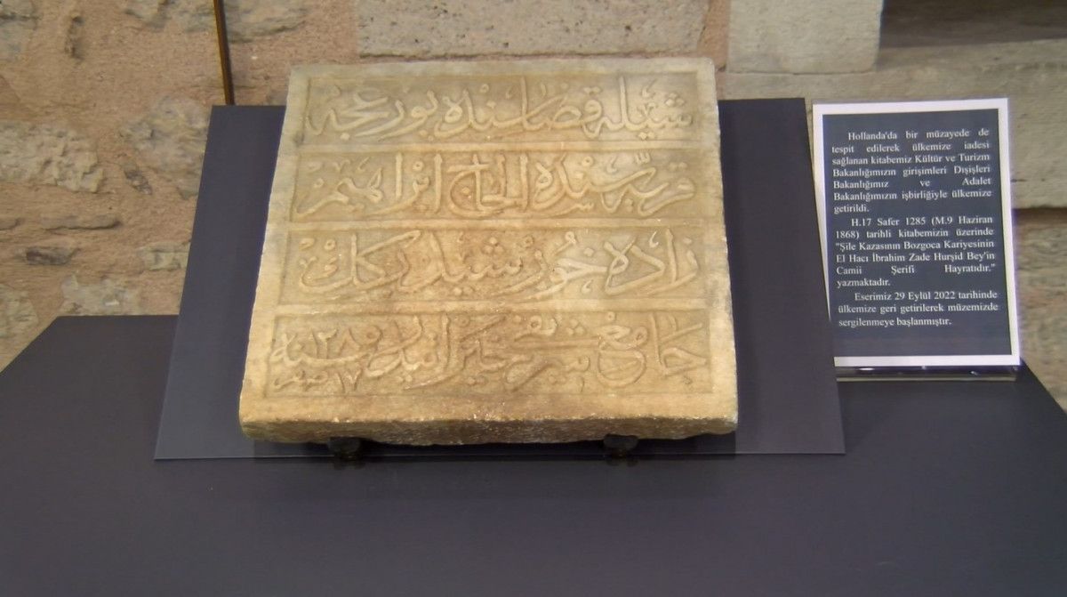 Üzerinde 'Şile Kazasının Bozgoca Kariyesinin El Hacı İbrahim Zade Hurşit Bey'in Camii Şerifi Hayratıdır' yazısı bulunan kitabenin, Türkiye'den yasadışı yollarla çıkarıldığı belirlendi.