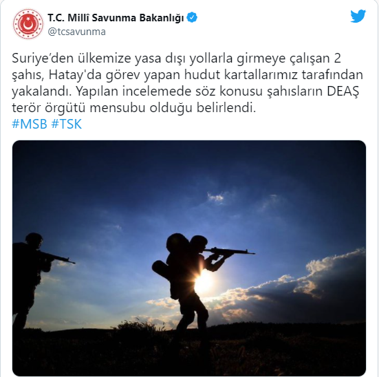 Milli Savunma Bakanlığı (MSB), "Suriye’den ülkemize yasa dışı yollarla girmeye çalışan 2 şahıs, Hatay'da görev yapan hudut kartallarımız tarafından yakalandı. Yapılan incelemede söz konusu şahısların DEAŞ terör örgütü mensubu olduğu belirlendi." açıklamasında bulundu.