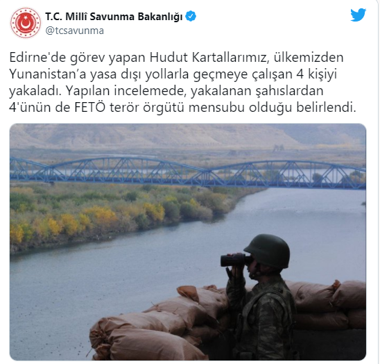Milli Savunma Bakanlığı, Yunanistan’a yasa dışı yollarla geçmeye çalışan 4 kişiyi yakaladığını açıkladı. MSB, "Yapılan incelemede, yakalanan şahıslardan 4'ünün de FETÖ terör örgütü mensubu olduğu belirlendi." dedi.
