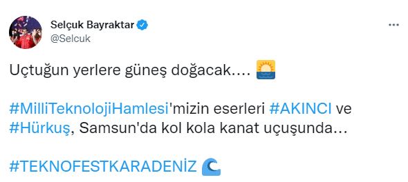 "Büyük Taarruz'un 100'üncü yılında, AKINCI'nın kolunda, Vecihi'nin ruhuyla, milli uçağımız Hürkuş'ta, milli mücadelemizin meşalesinin yandığı yer Samsun'da, TEKNOFEST semalarında, uçağa dokunan bir çocuğun heyecanıyla, yüzbinlerle teknoloji yarışmalarına katılmış genç kardeşlerimi ve milletimizi selamlıyorum. Yaşasın Milli Teknoloji Hamlesi ile güçlü Türkiye... Yaşasın tam bağımsız Türkiye..."