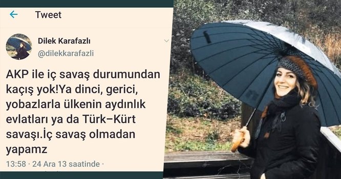 Fethullahçı terör ötgütü (FETÖ)'nün 15 Temmuz darbe girişiminde sosyal medya hesabından terör örgütünün propagandasını yapan ve Cumhurbaşkanı Recep Tayyip Erdoğan'ın gözaltına alındığı yalanını servisleyerek Saffet Dağbakan'ın İstanbul Bilişim ve Akıllı Kent Teknolojileri A.Ş.'de (İSBAK) görev yaptığının ortaya çıkmasından sonra Dilek Karafazlı'nın da "AK Parti ile iç savaş durumundan kaçış yok! Ya dinci, gerici, yobazlarla ülkenin aydınlık evlatları ya da Türk-Kürt savaşı. İç savaş olmadan yapamaz" yazdığı görüldü.