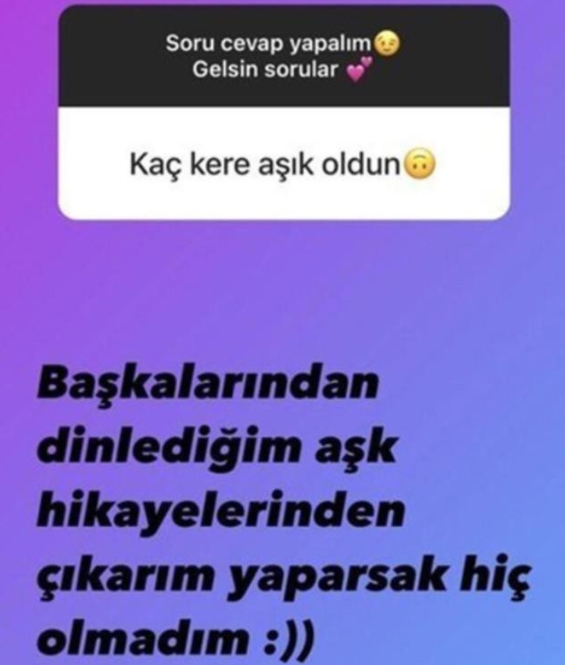 Ardından "Kaç kere aşık oldunuz?" sorusu yöneltilen Ayşegül Yıldız, "Başkalarından dinlediğim aşk hikayelerinden çıkarım yaparsak hiç olmadım" şeklinde dikkat çeken bir itirafta bulundu.