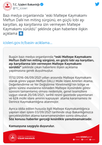 İçişleri Bakanlığı, “Eski Maltepe Kaymakamı Meftun Dallı’nın miting sürgünü, en güçlü lobi aşı karşıtları, aşı karşıtlarına izin vermeyen Maltepe Kaymakamı sürüldü” haberini yalanladı.