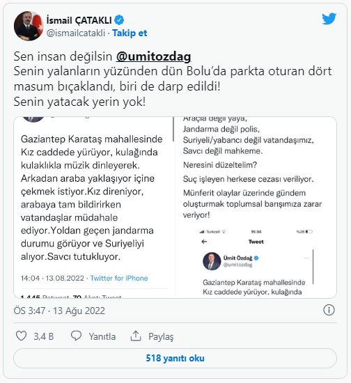 İçişleri Bakan Yardımcısı İsmail Çataklı, Ümit Özdağ'ın paylaşımına çok sert tepki gösterdi. Çataklı, "Sen insan değilsin Ümit Özdağ. Senin yalanların yüzünden dün Bolu'da parkta oturan dört masum bıçaklandı, biri de darp edildi. Senin yatacak yerin yok" ifadelerini kullandı.