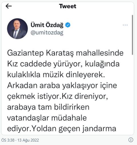 Irkçılık ve mülteci düşmanlığıyla gündemde kalan Zafer Partisi Genel Başkanı Ümit Özdağ, yine tehlikeli bir paylaşım yaptı. Özdağ, Gaziantep'te yolda yürüyen bir kızın Suriyeliler tarafından zorla arabaya bindirilmek istediğini, vatandaşın müdahalesi sonrası kurtarıldığını, Suriyelilerin ise tutuklandığını iddia etti.
