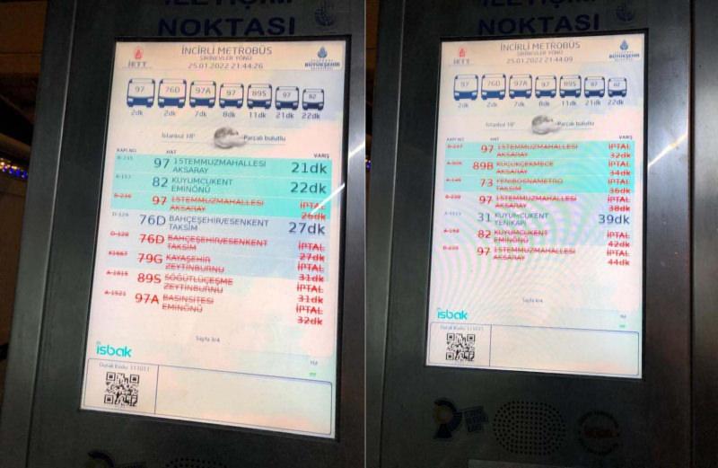 Özel araçlarla sokağa çıkılmaması uyarısı yapılan İstanbul'da iptal olan İETT seferleri vatandaşı dondurucu soğukta zorladı. Otobüslerin durağa varış dakikalarını gösteren ekranlarda iptal yazıları dikkat çekti.