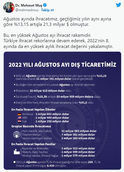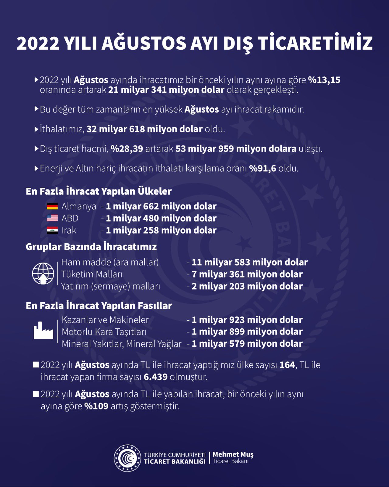 "İhracatta 2021 yılında yakalanan başarı 2022 yılının ilk 8 ayında da devam etmiştir. İhracatımız Ağustos ayında yüzde 13 yükselerek 21.3 milyar Dolar olarak gerçekleşmiştir. Bu, en yüksek Ağustos ayı ihracat rakamıdır, Türkiye ihracat rekorlarına devam ederek, 2022'nin 8. ayında da en yüksek aylık ihracat değerini yakalamıştır.