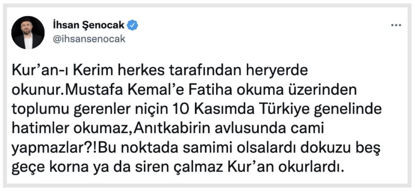 "Kur'an-ı Kerim herkes tarafından her yerde okunur. Mustafa Kemal'e Fatiha okuma üzerinden toplumu gerenler için 10 Kasım'da Türkiye genelinde hatimler okumaz, Anıtkabir'in avlusunda cami yapmazlar?! Bu noktada samimi olsalardı dokuzu beş geçe korna ya da siren çalmaz Kur'an okurlardı"
