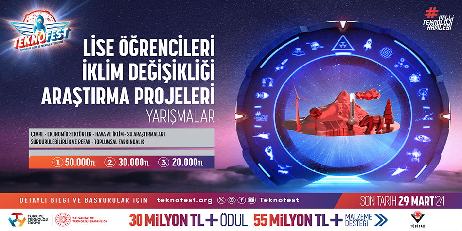 Lise öğrencileri iklim değişikliği araştırma projeleri yarışmasında tüm kategorilerin birincilerine 50 bin TL, ikincilerine 30 bin TL, üçüncülerine ise 20 bin TL ödül verilecek. Son başvuru tarihi 29 Mart 2024 olan yarışma için sen de www.teknofest.org adresine gir ve hemen katıl.