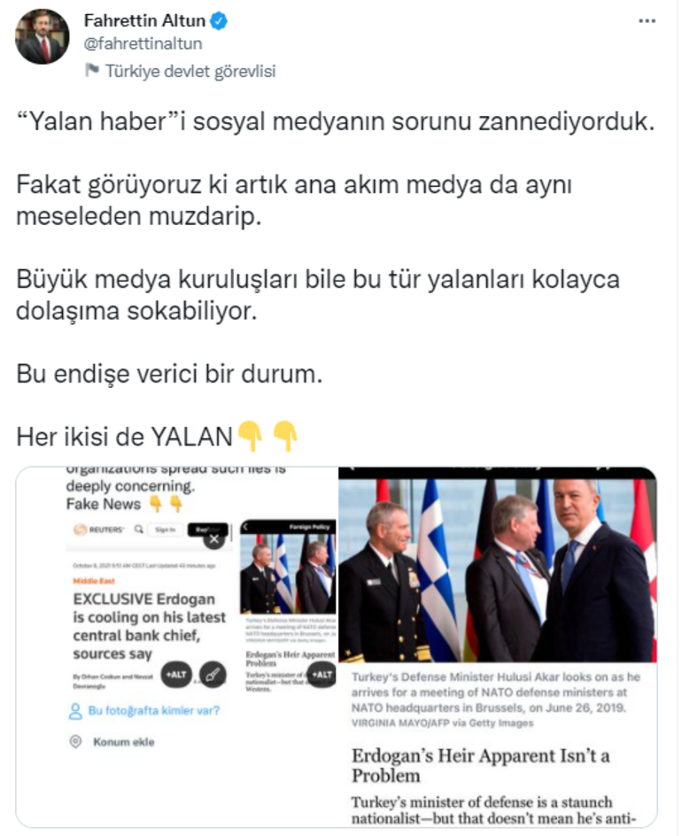 Cumhurbaşkanlığı İletişim Başkanı Fahrettin Altun, Reuters’ın Türkiye Cumhuriyet Merkez Bankası (TCMB) Başkanı Şahap Kavcıoğlu ile ilgili haberinin yalan olduğunu belirtti. Altun, Foreign Policy’nin Türkiye ile ilgili uydurma bir haberini de “yalan habere” örnek olarak gösterdi.