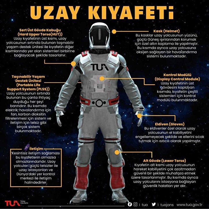 Türkiye Uzay Ajansı (TUA) tarafından yapılan bir paylaşım ile, ilk Türk astronot tarafından kullanılacak uzay kıyafeti özellikleri ve tasarımı belli oldu. Burada 7 farklı sınıfa ayrılan giysinin kasktan iletişim ünitesine kadar pek çok parçasının detayı gösterildi.