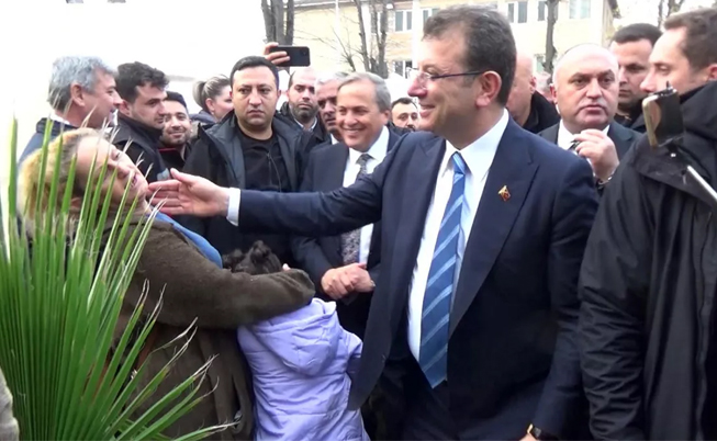 Kafasını hızla geriye çeken kadın, "Elleme beni, deprem bitti" diye bağırdı. Ekrem İmamoğlu ise yoluna devam ederken, 'olsun' demekle yetindi.