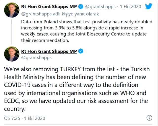 Grant Shapps, Twitter hesabı üzerinden yaptığı açıklamada, Türkiye'nin Sağlık Bakanlığı, Covid-19 vakalarını, Dünya Sağlık Örgütü (WHO) ve Avrupa Hastalık Önleme ve Kontrol Merkezi (ECDC) gibi uluslararası örgütlerin tanımından farklı şekilde tanımlaması hasebiyle Türkiye'nin, İngiltere'nin seyahat listesinden çıkarıldığını duyurarak Türkiye'yle ilgili risk değerlendirmesinin güncellendiğini belirtti.