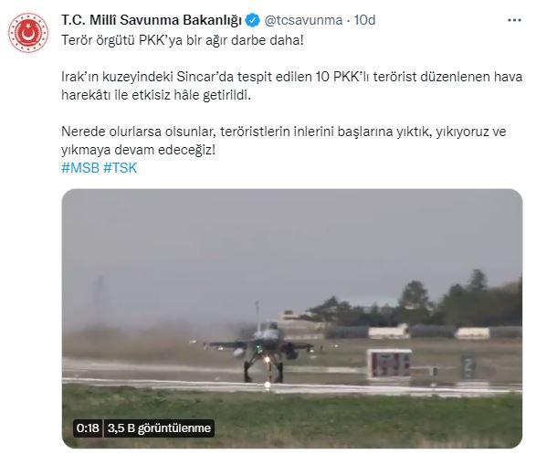 Milli Savunma Bakanlığı'ndna yapılan açıklamada; "Terör örgütü PKK'ya bir ağır darbe daha! Irak'ın kuzeyindeki Sincar'da tespit edilen 10 PKK'lı terörist düzenlenen hava harekâtı ile etkisiz hâle getirildi. Nerede olurlarsa olsunlar, teröristlerin inlerini başlarına yıktık, yıkıyoruz ve yıkmaya devam edeceğiz!" ifadeleri kullanıldı.