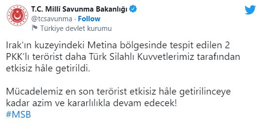 Milli Savunma Bakanlığından yapılan açıklamada, "Irak'ın kuzeyindeki Metina bölgesinde tespit edilen 2 PKK'lı terörist daha Türk Silahlı Kuvvetlerimiz tarafından etkisiz hale getirildi. Mücadelemiz en son terörist etkisiz hale getirilinceye kadar azim ve kararlılıkla devam edecek." ifadelerine yer verildi.