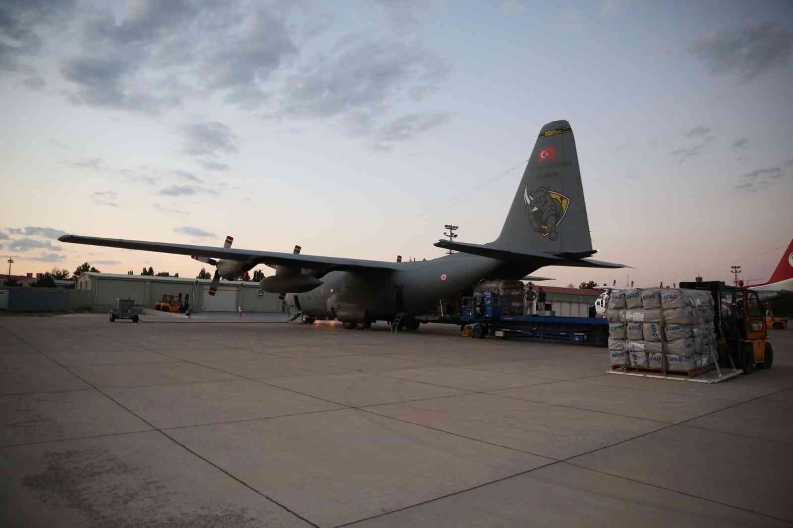 Paylaşımda, yardım malzemelerinin yüklendiği uçağa ait fotoğraflar da yer aldı.