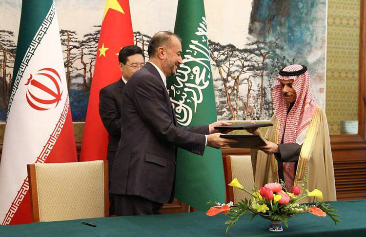 İran devlet televizyonunun haberine göre, İran Dışişleri Bakanı Hüseyin Emir Abdullahiyan ile Suudi Dışişleri Bakanı Faysal bin Ferhan, Çin'in başkenti Pekin'de bir araya geldi.