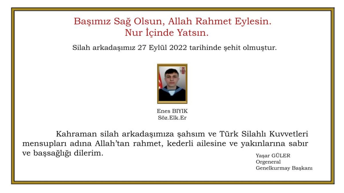 "Gölcük Tersane Komutanlığımızda, 27 Eylül 2022 tarihinde meydana gelen iş kazasında, kahraman silah arkadaşımız Söz.Elk. Er Enes Bıyık şehit olmuş, bir kahraman silah arkadaşımız da yaralanmış ve derhal hastaneye sevk edilerek tedavisine başlanmıştır."