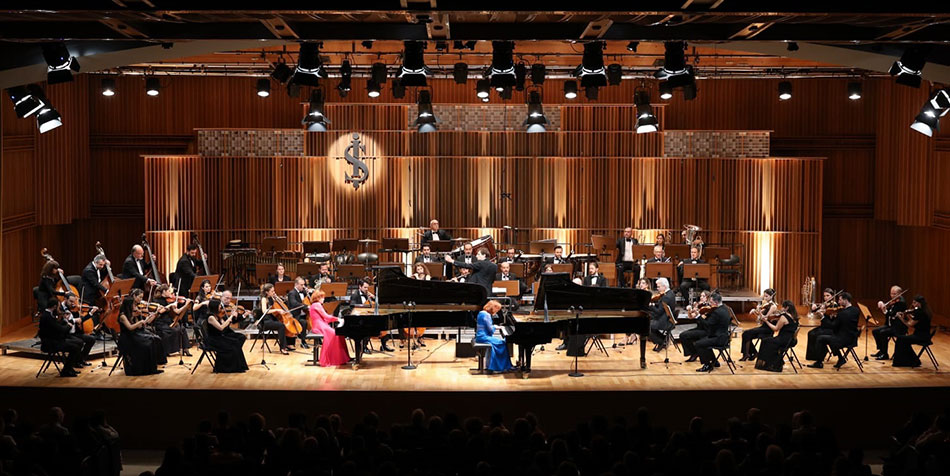 Bu özel açılış konseri, Leonard Bernstein’ın 1956’da bestelediği ve alışılmadık bir şekilde sonat formunda yazılan Candide Uvertürü ile başladı. Operetin enfes ezgilerini, tüm nüktedanlık, canlılık ve karmaşıklığı ile barındıran bu uvertürün ardından Güher ve Süher Pekinel, Francis Poulenc’in 1927-28 yıllarında iki piyano için yazdığı Re minör konçertosunu seslendirdi. Seyircileri kendilerine hayran bırakan performanslarında müziğin nabzına yoğunlaşan Pekinellerin konçertoyu icrasının ardından konser, Ludwig van Beethoven’ın en sevdiği eseri olduğu bilinen 7 numaralı senfonisi ile sona erdi.