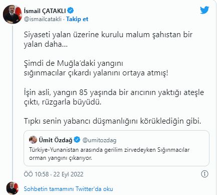 Çataklı, yangının çıktığı bölgenin görüntülerini paylaşarak Özdağ'a "İzle yalancı" diye seslendi.