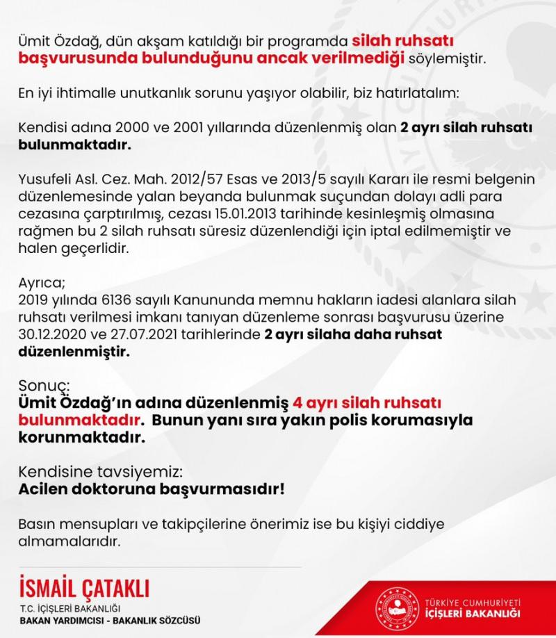 İçişleri Bakan Yardımcısı İsmail Çataklı, Özdağ'ın iddiası sonrası sosyal medyadan açıklama yaptı. "En iyi ihtimalle unutkanlık sorunu yaşıyor olabilir, biz hatırlatalım" ifadesini kullanan Çataklı şu açıklamayı yaptı: