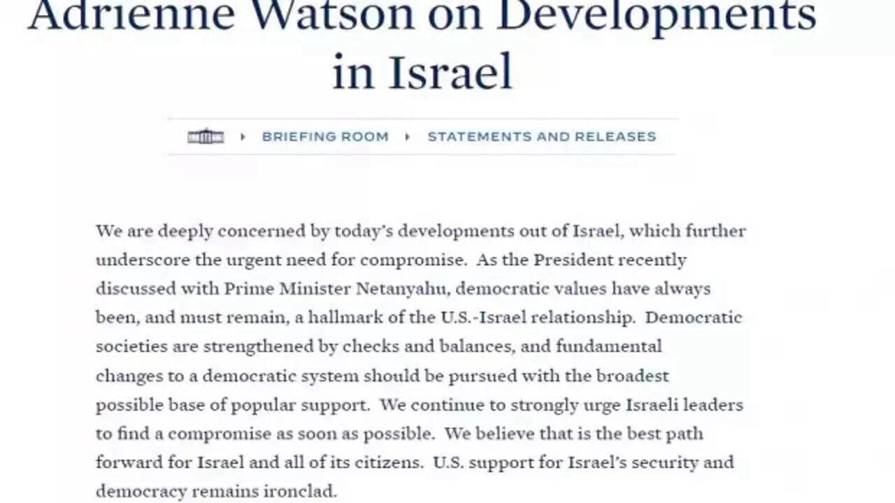 Beyaz Saray’da yayınlanan açıklamada, ABD Ulusal Güvenlik Konseyi Sözcüsü Watson, “İsrail’de yaşanan gelişmelerden derin endişe duyuyoruz ve acil uzlaşma ihtiyacının altını çiziyoruz.