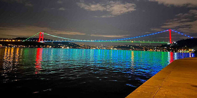 15 Temmuz Şehitler Köprüsü, FSM ve Yavuz Sultan Selim Köprüsü kırmızı, mavi ve yeşil renklere büründü. Akşam saatlerinde başlayan uygulama sabah saatlerine kadar sürecek.