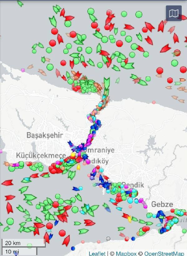 İstanbul Boğazı girişlerinde geçiş için bekleyen yüzlerce gemi havadan görüntülenirken Gemi radar sisteminde de boğazların giriş çıkışlarında geçiş için bekleyen çok sayıda geminin olduğu gözlendi.