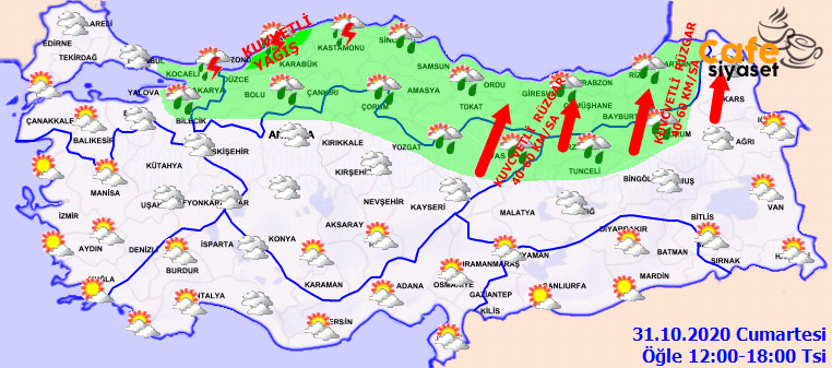 Yağışların İstanbul'un kuzeydoğu bölgelerinde, Sakarya ve Kocaeli'nin kıyı bölgeleriyle Batı Karadeniz'de Zonguldak, Bartın ve Düzce çevrereleriyle, Giresun ve Ordu illerinde ve Kastamonu'daki kıyı kesimlerde akşam saatlerinde kuvvetli yağış olması bekleniyor. Yağışların kuvvetinin 21-50 kg/m2 olacağı ön görülüyor.