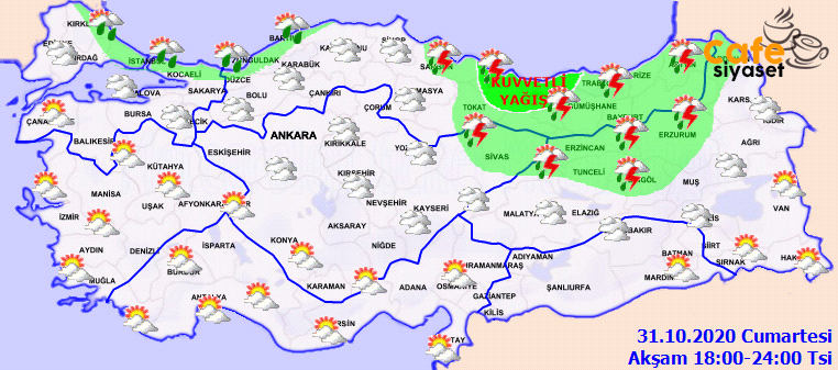 Meteoroloji Genel Müdürlüğü'ne ait resmi internet sitesinden alınan verilere göre Türkiye'nin Marmara ve Karadeniz bölgeleriyle birlikte Yozgat, Çankırı, Tunceli, Erzurum, Erzincan, Ardahan, Bingöl ve Sivas çevrereleri aralıklı olarak sağanak ve gök gürültülü sağanak yağış yaşayacak. Türkiye'deki diğer bölgelerde ise parçalı bulutlu bir hava durumu görülecek.