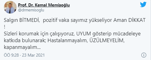 Memişoğlu sosyal medya hesabından uyarıda bulundu. Kemal Memişoğlu, "Salgın bitmedi, pozitif vaka sayımız yükseliyor. Aman dikkat! Sizleri korumak için çalışıyoruz, uyum gösterip mücadeleye katkıda bulunarak; hastalanmayalım, üzülmeyelim, kapanmayalım..." dedi.
