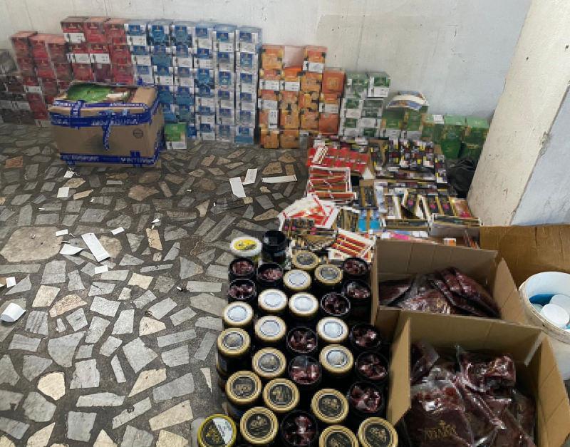 "10 ton 10 kilogram nargile tütünü, 955 kilogram tütün, 700.800 dal boş makaron, 291.616 dal dolu makaron, 360 sökülmüş TAPDK belgesi, 4 sigara dolum makinesi, 1.160 litre gliserin, 861 litre nargile tütünü aroması, 1.250 adet puro, 1.870 paket kaçak sigara, 700 elektronik sigara likidi, 89.130 adet nargile tütün ambalaj malzemesi, 2 elektronik hamur yoğurma makinesi, 9 elektronik poşet vakumlama makinesi, 15.850 muhtelif miktarlarda kaçak nargile tütün etiketi, 7 kantar ve hassas terazi, 500 gram renklendirici toz, 12 adet kazan, 1 adet varil."