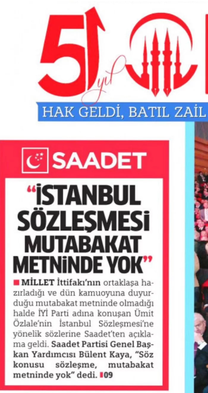 Saadet Partisi Genel Başkan Yardımcısı Mahmut Arıkan, 'İstanbul Sözleşmesi' çıkışı yapan İYİ Partili Ümit Özlale'ye sert tepki gösterdi. Arıkan yaptığı konuşmada, "Bu çıkış siyasi bir nezaketsizliktir. Biz İYİ Parti'nin kırmızı çizgilerine saygı gösteriyorsak aynı nezaketi de İYİ Partililerden görmek isteriz" ifadelerini kullandı.
