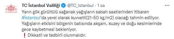 İstanbul Valiliğinin Twitter hesabından yapılan açıklamada, yarın sabah saatlerinden itibaren gök gürültülü sağanağın İstanbul'da yerel olarak kuvvetli olacağının tahmin edildiği belirtildi.