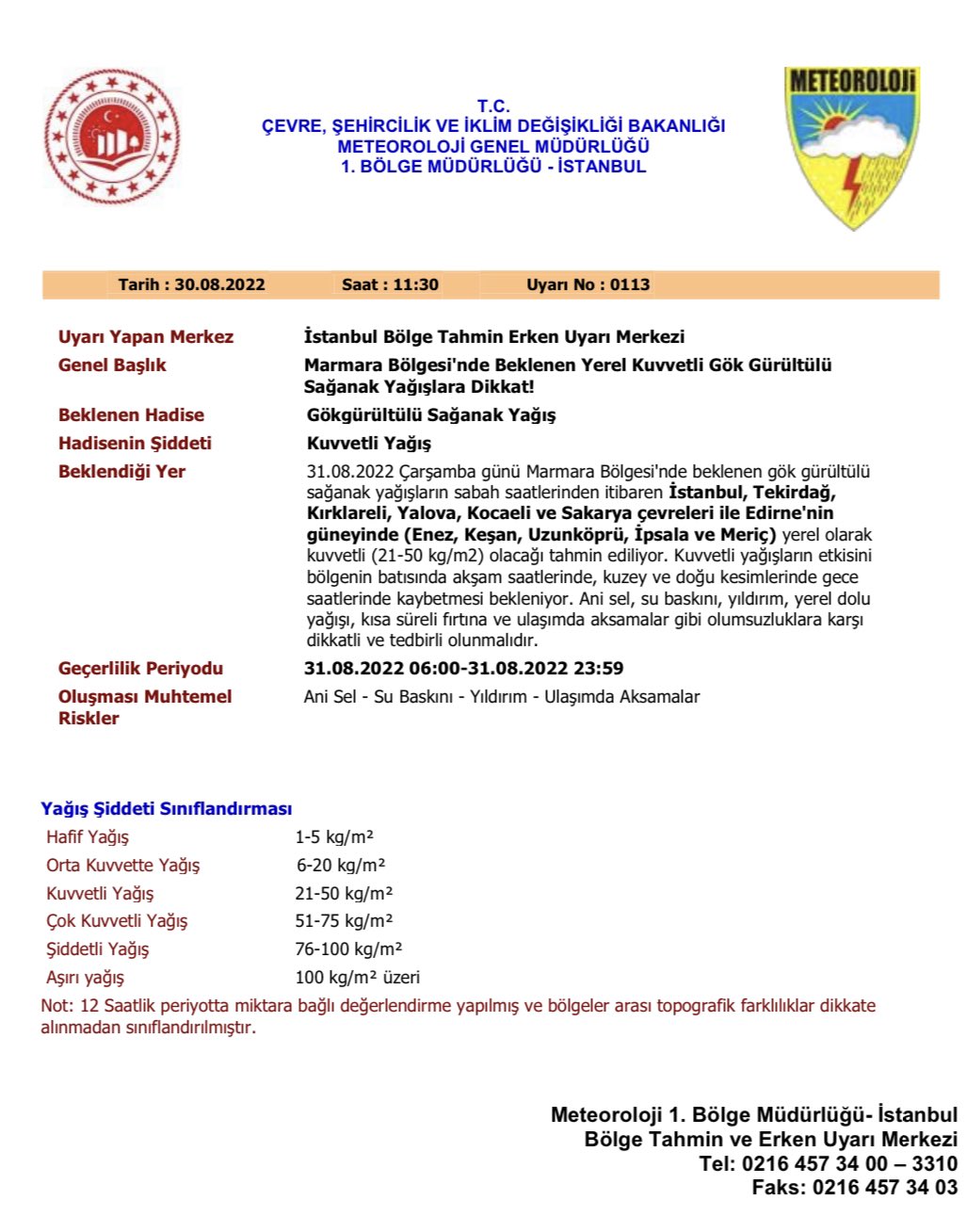 Açıklamada, "Yağışların etkisini bölgenin batısında akşam, kuzey ve doğu kesimlerinde gece kaybetmesi bekleniyor. Dikkatli ve tedbirli olunmalıdır." ifadelerine yer verildi.