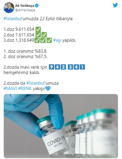Vali Yerlikaya, 942 bin 341 kişinin 2. doz aşısını yaptırması gerektiğini vurguladı ve "İstanbulumuza 2. dozda mavi renk yakışır" dedi.